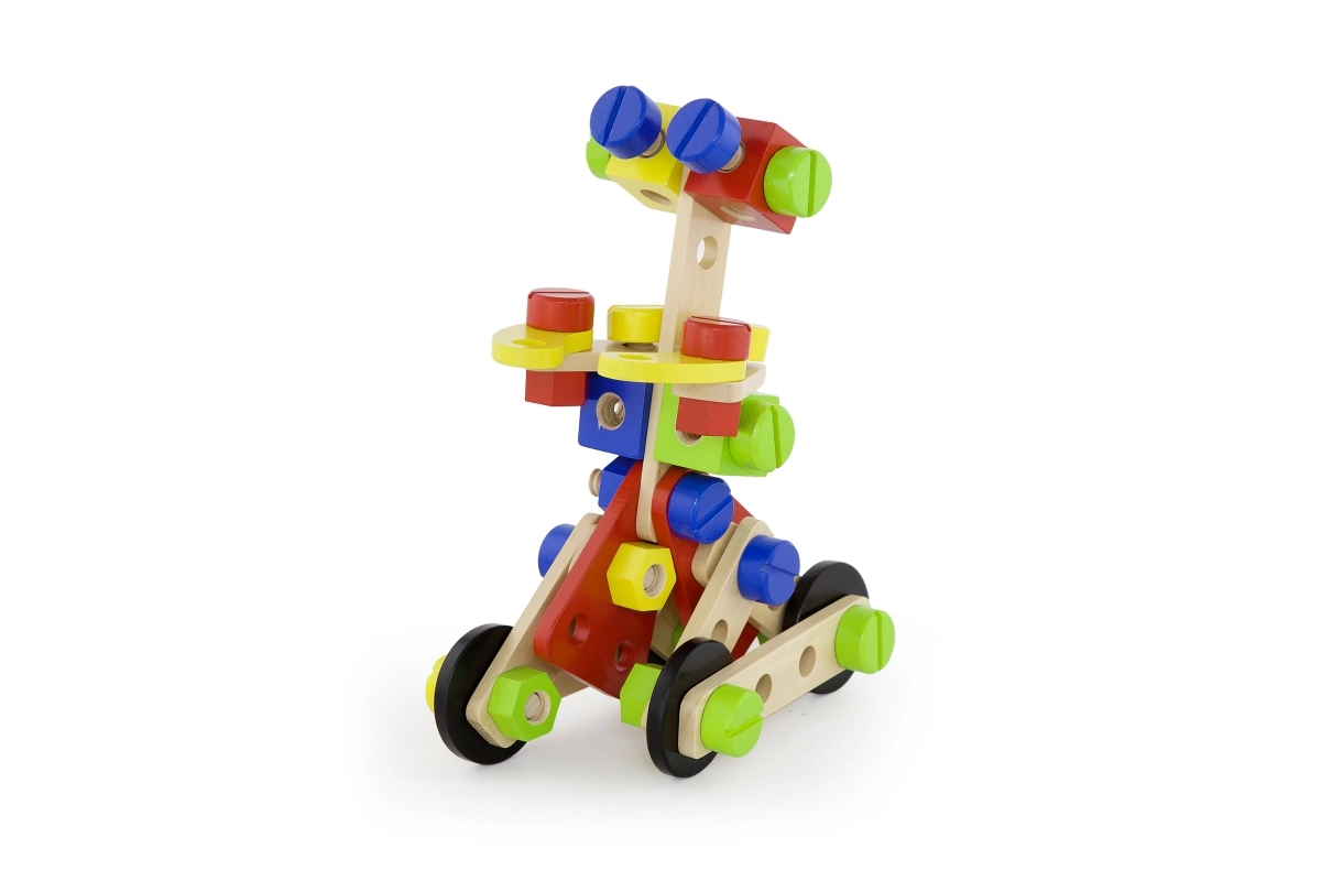 Прецизно изработените елементи от букова или яворова дървесина имат гладко шлайфани, заоблени ръбове и са третирани с безопасни бои на водна основа. Благодарение на устойчивата изработка и точните размери частите пасват лесно, осигуряват стабилност и издържат дори на сложни конструкции. Дървените конструктори са също екологични и приятни на допир.