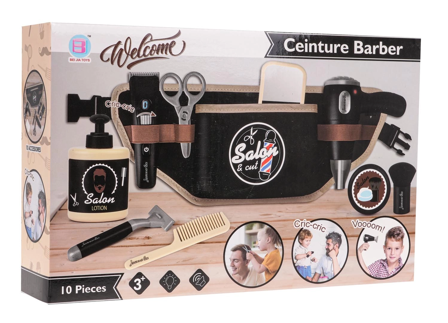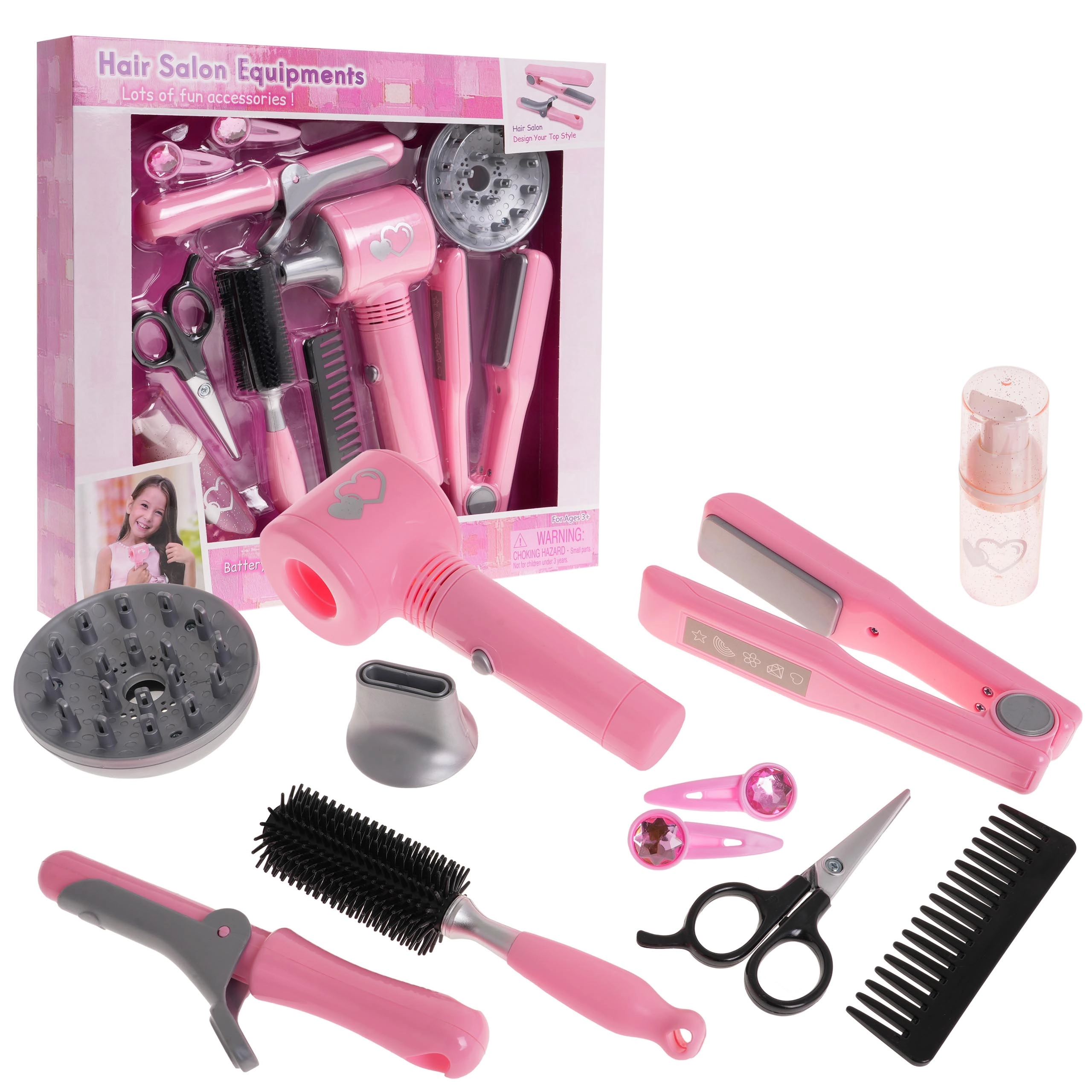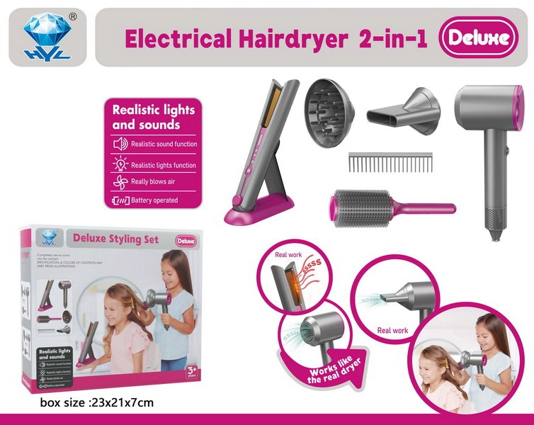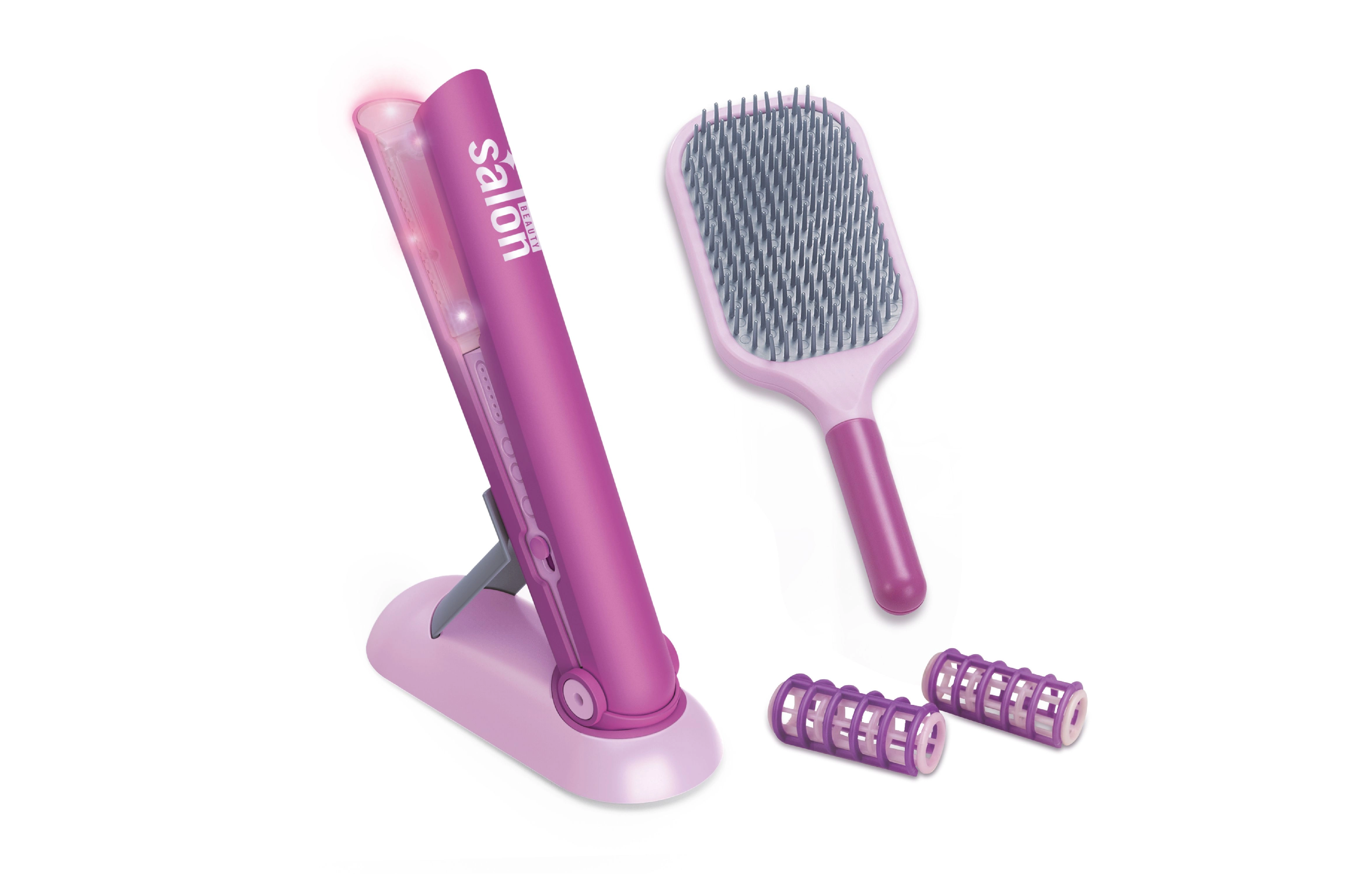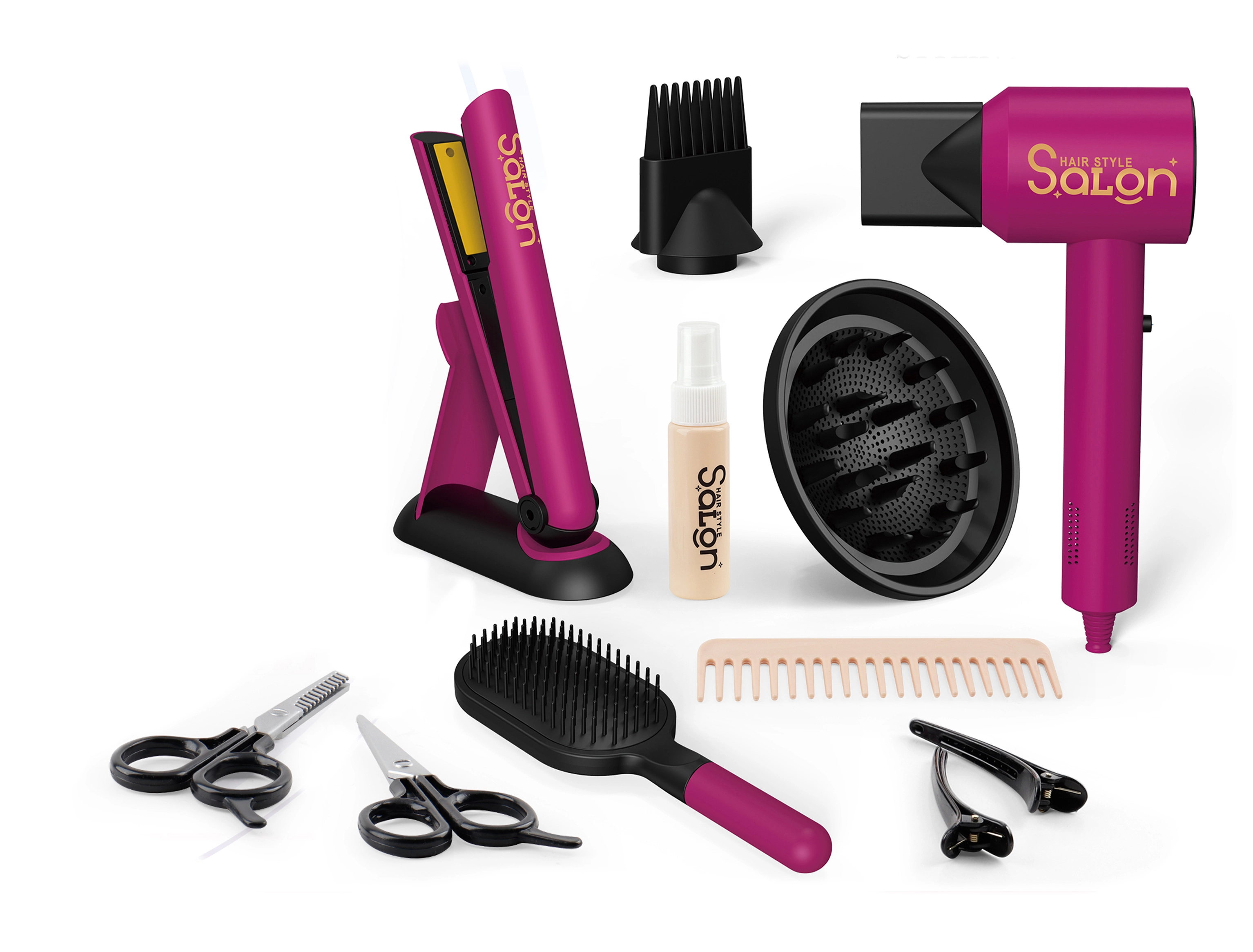 В комплектите ще откриете и маша, преса за коса, ролки, шноли и ластици – всичко за стайлинг на косата и модерни прически. Фризьорските принадлежности за деца имат реалистични детайли, като същевременно са адаптирани към детската ръка и удобния захват. Играта с тях подпомага развитието на фината моторика, координацията око–ръка, въображението и социалните умения при обслужването на клиенти в салона за красота.