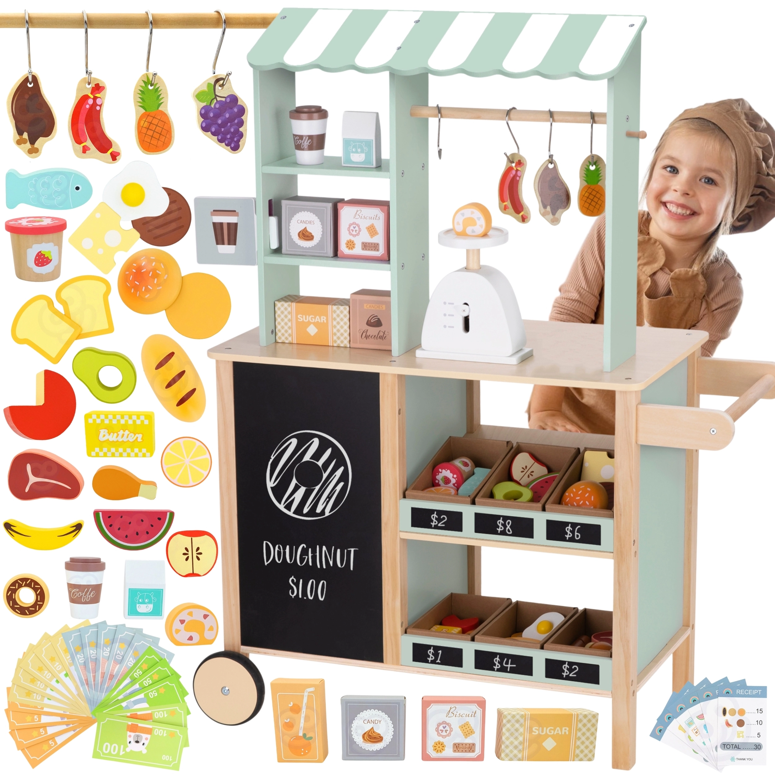 Играта на магазин подпомага ученето чрез игра: децата тренират броене, развиват комуникация и социални умения, упражняват фината моторика и логическото мислене. Комплектите за деца 3+, 4+ и 5+ варират от опростени щандове с продукти до комплексни касови станции с тъчскрийн каса, чекмедже за банкнони и монети, везна, микрофон и дисплей.