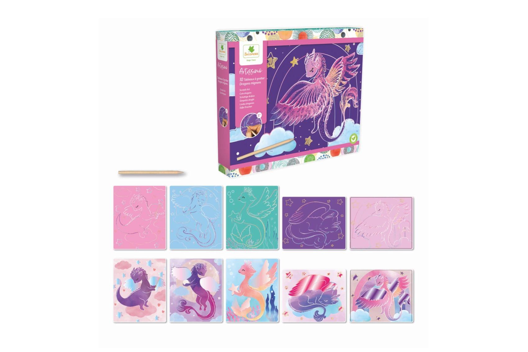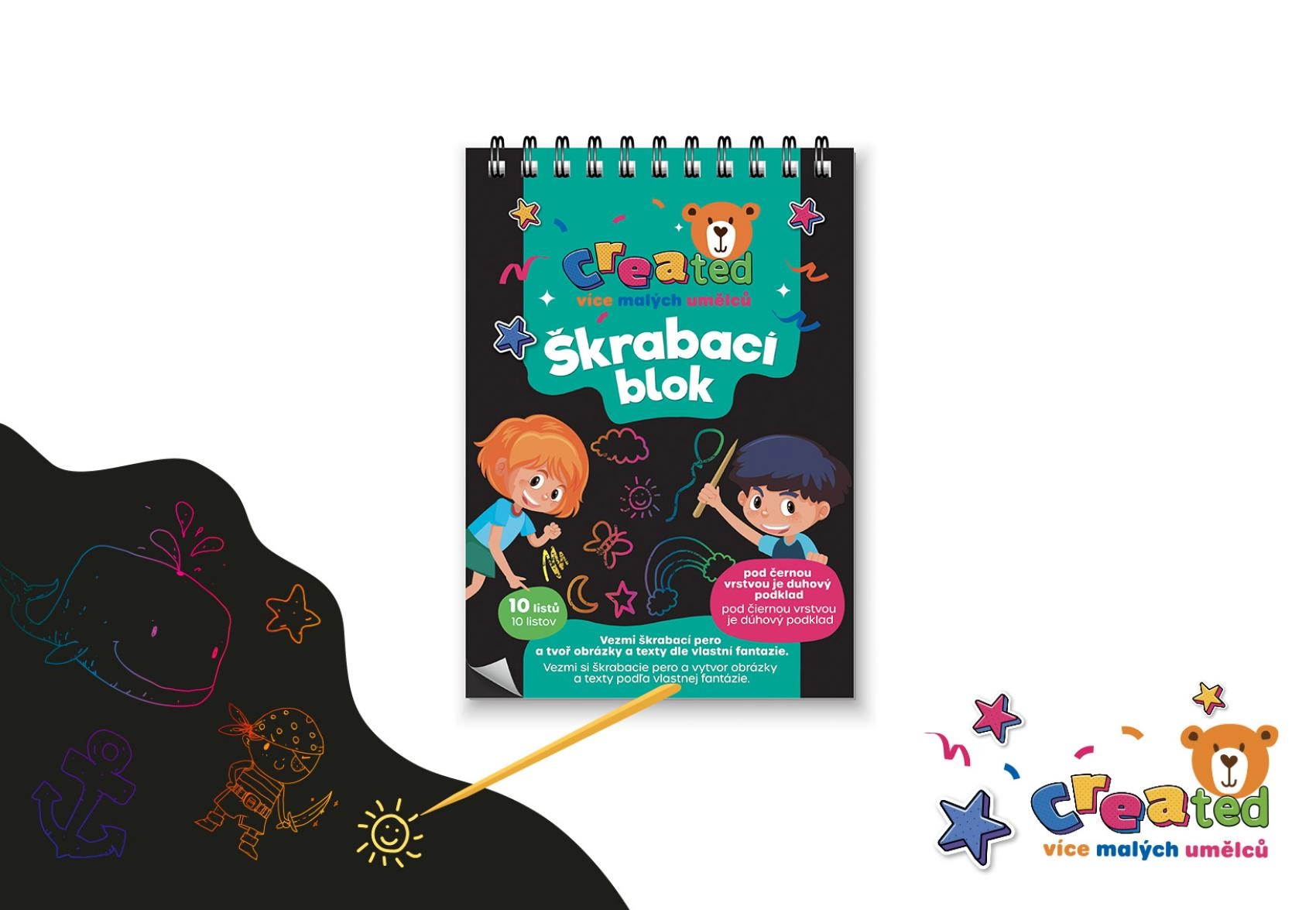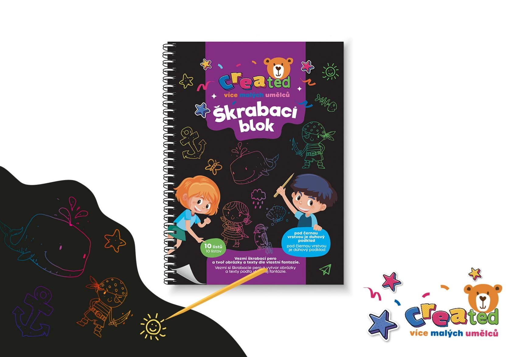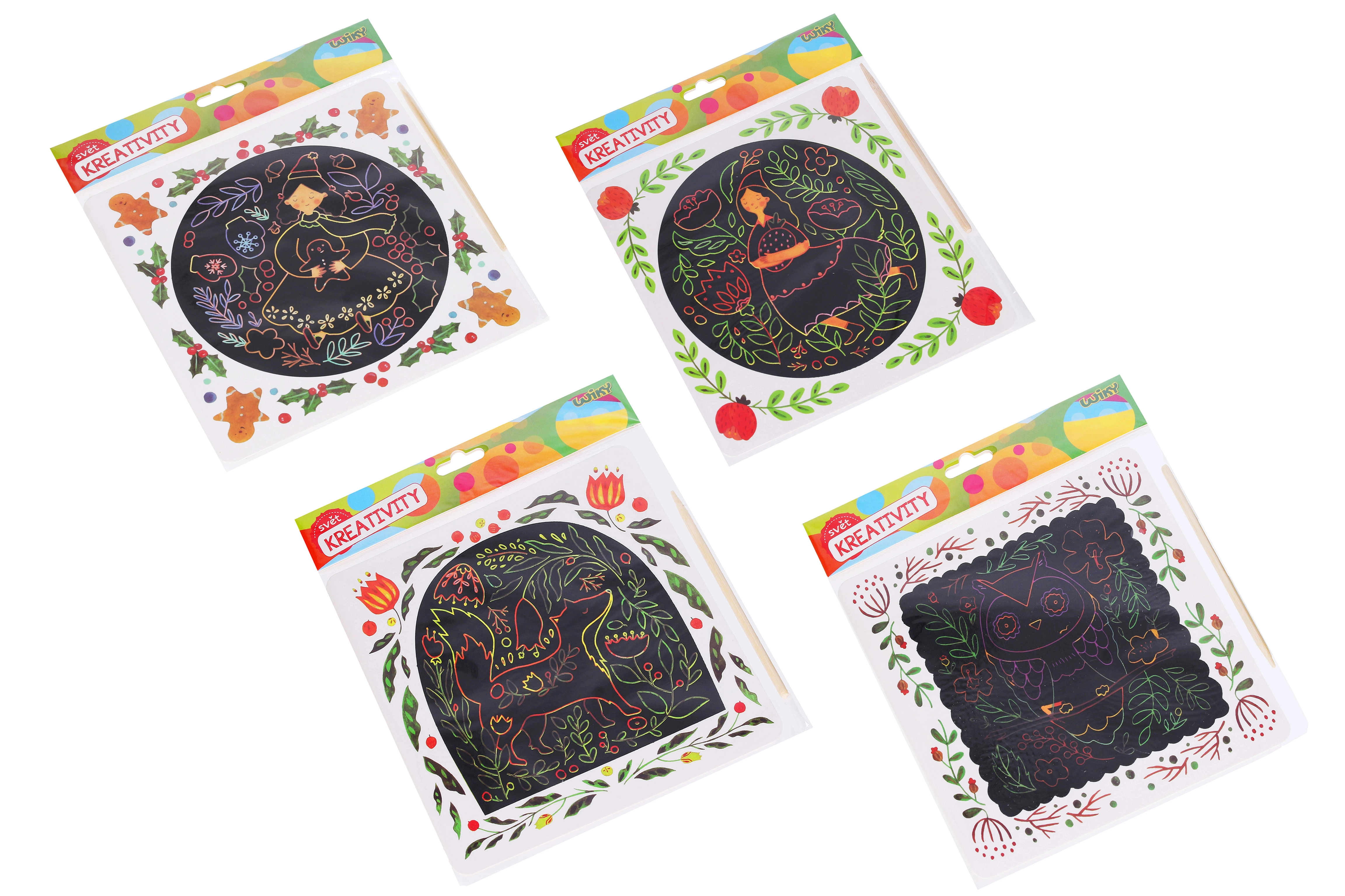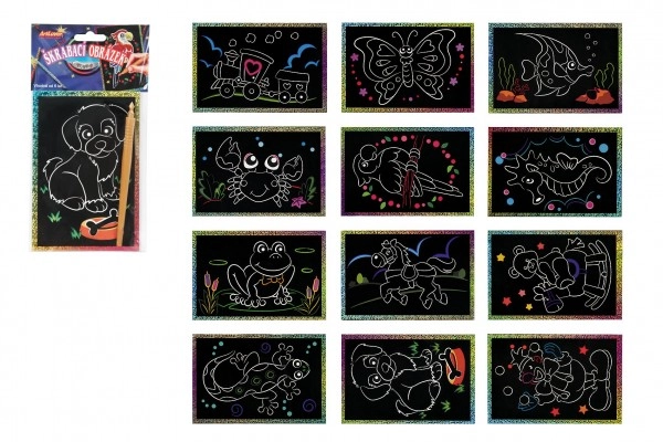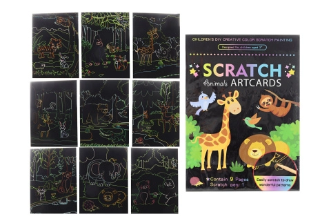 Под черния слой се крие цветен свят – нужни са само няколко движения със стилото и се раждат вълшебни изстъргващи картинки. Scratch art (стържещи, стриващи картинки) е сред любимите творчески играчки и креативни комплекти с дъгови, блестящи и металически ефекти, които носят бързи резултати. Комплектите обикновено съдържат дървено стило, шаблони и модели; върху черни карти формат A5 или A4 лесно създавате мотиви с животни, динозаври, еднорози, космос или мандали.