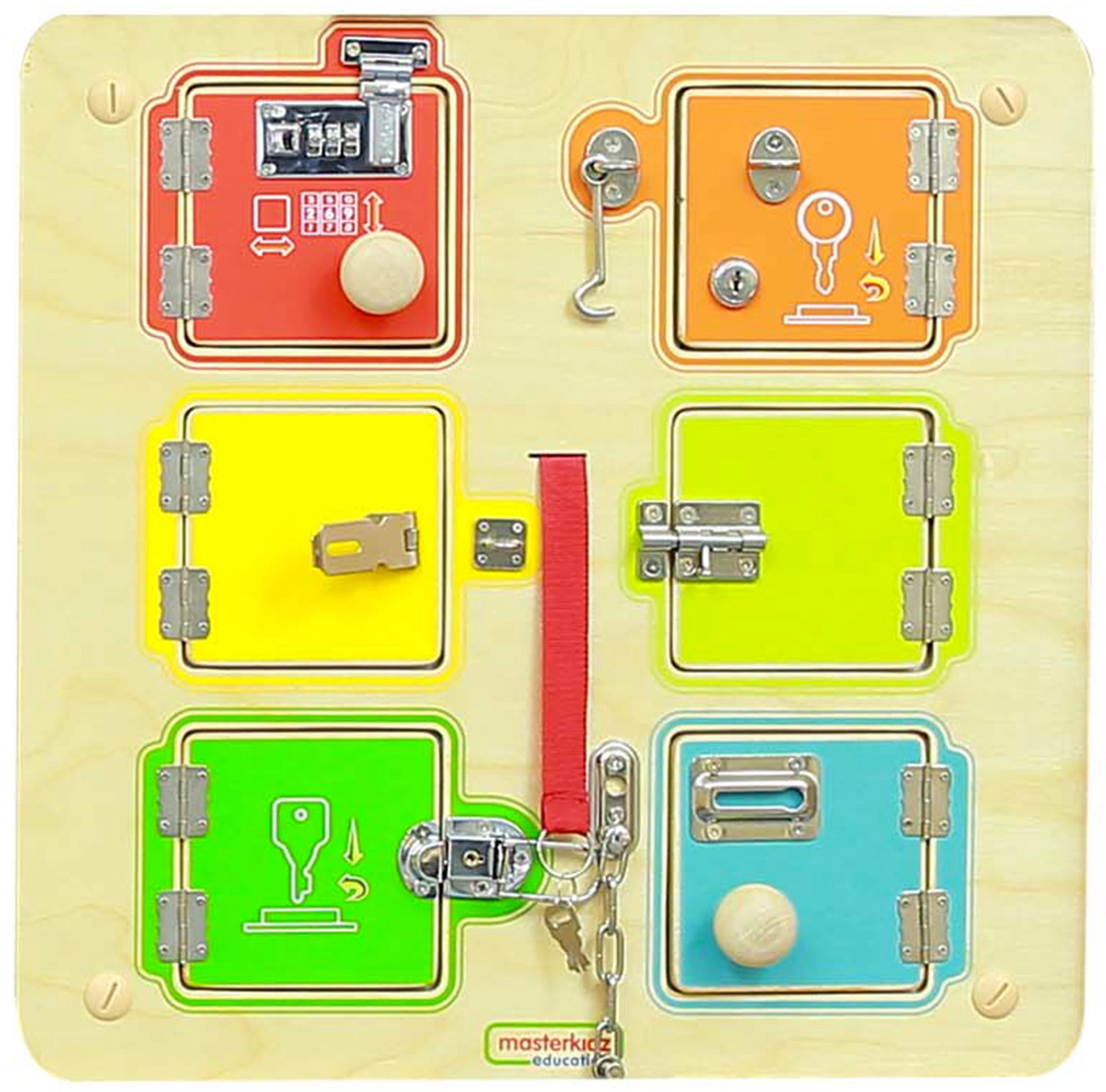 Всяка моторна дъска крие оригинални елементи: ципове, катарами, връзки, ключалки, зъбни колела, плъзгачи, лабиринти, превключватели, велкро, сметало или форми. Децата тренират практични умения (закопчаване на цип, връзване на връзки), развиват сетивното възприятие и уменията за решаване на проблеми. Гладки повърхности, бои на водна основа и здравa изработка осигуряват комфортна и безопасна игра.