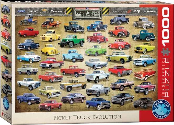 Открийте стилен пъзел с мотив еволюцията на пикапите от марката EUROGRAPHICS със 1000 части. Специалната неконвенционална щанца с нетрадиционни форми на елементите повишава трудността и носи по-дълго и забавно подреждане. Надписите на изображението са на английски език. Размер след подреждане приблизително 67,63 × 48,89 cm.