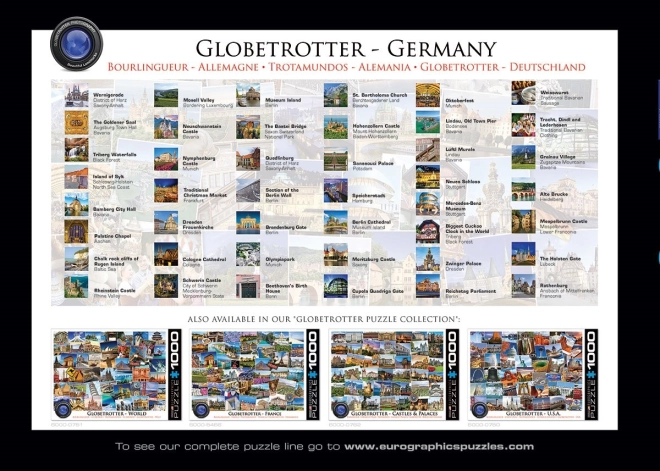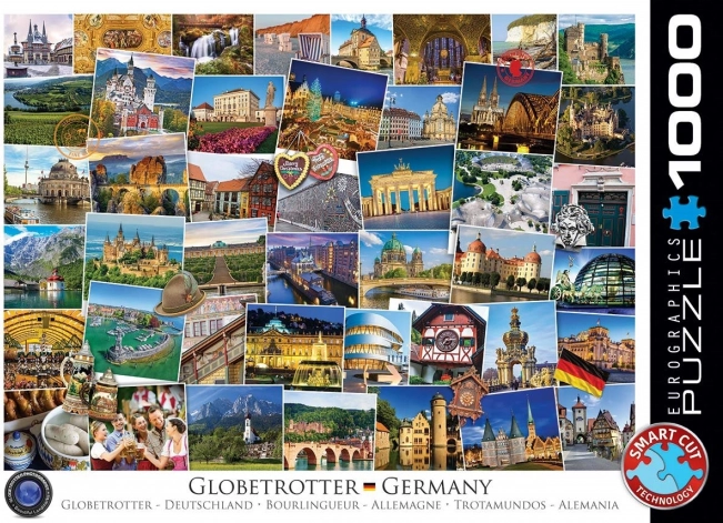 Открийте красотите на Германия с качествения пъзел EUROGRAPHICS от 1000 части. Благодарение на уникалната щанца с неправилни форми подреждането е предизвикателство и същевременно забавление. Размерът след нареждане е приблизително 68 × 48 cm. Оригинални форми на частите, по-висока трудност и детайлна карта на Германия ще зарадват всеки любител на пъзели и пътешествия.