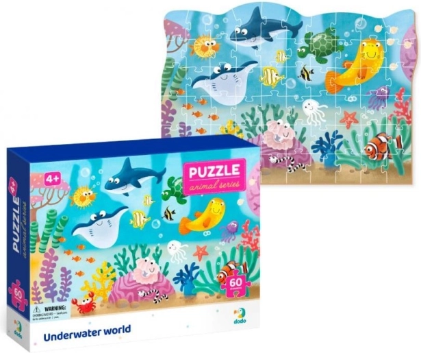 Открийте магията на океана с детския пъзел DODO на тема подводен свят. Пъзелът от 60 части предлага красиви илюстрации, качествена изработка и контурен ръб за по-лесно подреждане. Готовата картина е с размер 32 × 23 cm и може да се свързва с други сцени от серията Свят на животните. Подходящ за деца от 4 години.