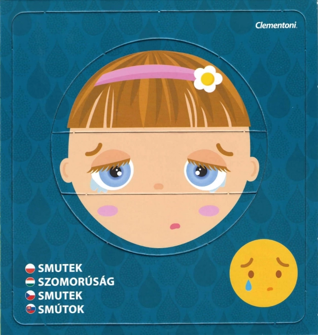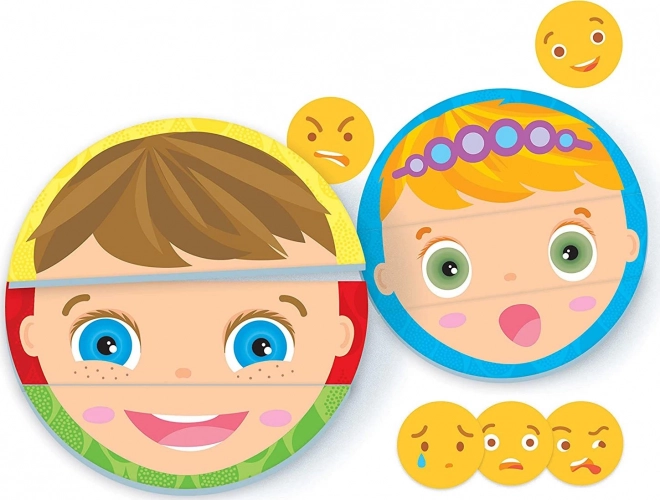 Забавен образователен пъзел за най-малките, който помага на децата да разпознават емоциите и мимиката. Комплектът съдържа 6 картинки по 3 части с названия на чувства и съответстващи емотикони. Учене на емоции чрез игра, тренировка на концентрацията и развитие на фината моторика в едно.