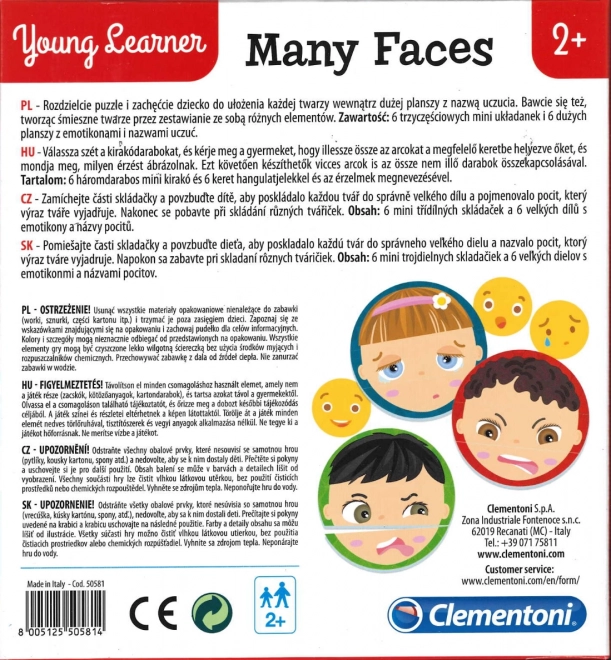 Открийте света на емоциите с детския пъзел CLEMENTONI Young Learner. Всяка от 6-те картинки се състои от 3 части и представя различно настроение с наименование на чувството и подходящ емотикон. Децата могат да подреждат лицата самостоятелно или да ги поставят в рамки, като по игрив начин упражняват разпознаването на изражения.