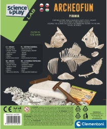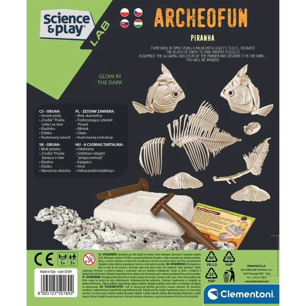 Станете малък палеонтолог и открийте скелета на хищна риба – пираня! Този забавен археологически комплект от марката Clementoni позволява на децата с помощта на включените инструменти внимателно да „извлекат“ фосила и да сглобят светещ скелет на пираня. По илюстрираното ръководство ще научите повече за фосилите, техния произход и къде днес живеят пирани. Страхотен избор за развитие на сръчност, креативност и интерес към науката.