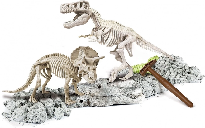 Този образователен комплект от серията Science & Play предлага автентично изживяване на палеонтологическо изследване. В „скалния“ блок ще откриеш части от два детайлни скелета, които внимателно ще освободиш с чукчето и длетото, а след това ще сглобиш в впечатляващи модели. Специалният флуоресцентен материал поглъща дневна светлина и след това свети в тъмното, което усилва уау ефекта и мотивира за допълнително изследване.