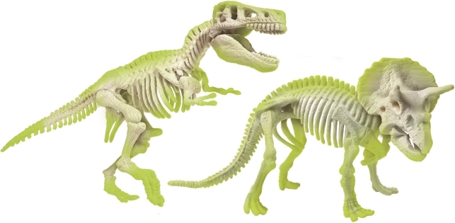 Флуоресцентните части на скелета абсорбират дневна светлина и светят в тъмното. Готовите модели на T‑Rex и Трицератопс са ефектна декорация и образователно средство.
