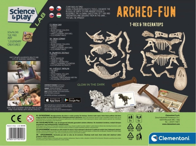 Включени са илюстрирано ръководство и образователни карти с факти за динозаври и фосилии. А благодарение на безплатното приложение Legendary Creatures с добавена реалност скелетите се превръщат в интерактивни 3D модели – идеална комбинация от учене и игра. Прекрасно за деца от 7 години, които обичат динозаври, експерименти и откривателство.