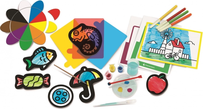Монесори комплектът от Clementoni е създаден, за да развива уменията на децата в областта на цветовете и изкуството. Децата могат да експериментират с цветовете и да използват различни художествени инструменти: