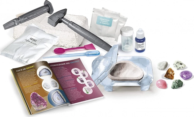 С този комплект децата ще станат малки геолози: с помощта на чукче и длето ще извлекат от подготвената тухла скрити скъпоценни камъни и минерали, които могат да добавят към своята колекция. Включена е и форма за изработка на собствена геода, която може да се украси с цветни и блестящи кристали.