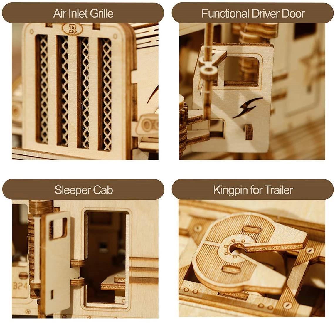Елементите, изрязани с лазер от липов шперплат, осигуряват лесно изваждане и сглобяване без нужда от лепило.
