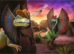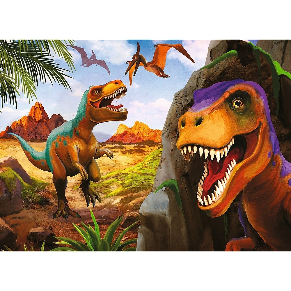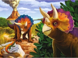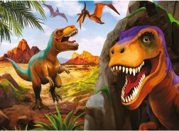 Пъзелът включва цветни илюстрации на динозаври в праисторическа среда, които привличат вниманието на децата и развиват тяхното въображение.