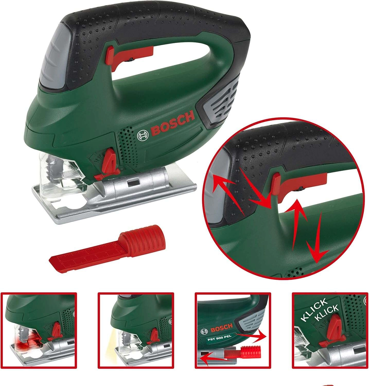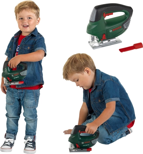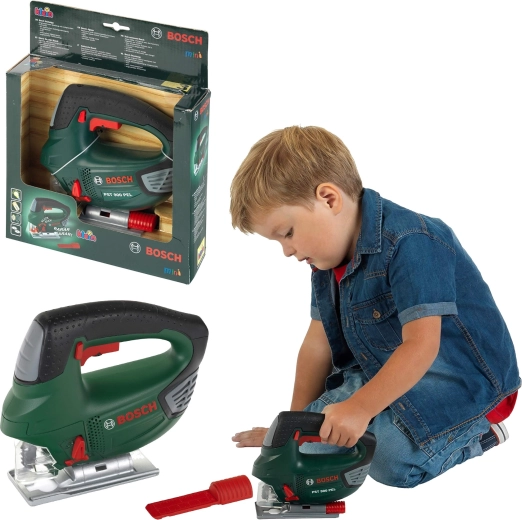 Детският прободен трион в емблематичния тъмнозелен цвят на BOSCH е вярно копие на истински инструмент, но напълно безопасен за деца. Здравата изработка и внимание към детайла подпомагат реалистичната игра, при която децата безопасно имитират възрастните и развиват сръчност и въображение.