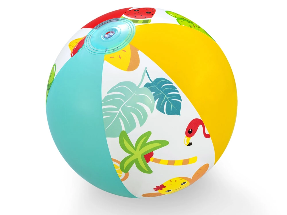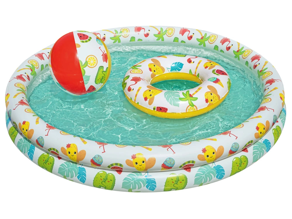 Лятно забавление в градината за миг! Този комплект 3в1 от BESTWAY комбинира надуваем басейн с диаметър 122 cm, пояс за плуване и плажна топка с весели тропически мотиви. Здравият винил, двойните въздушни камери и лесната преносимост гарантират безопасно и игриво освежаване за най-малките.