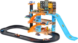 Тази голяма и здрава паркинг кула предлага четири нива, пълни със забавление. На горното ниво има вертоплощадка за хеликоптер, а надолу води забавна пързалка за малките автомобили. На всеки етаж има паркоместа, а на втория етаж се намира рампа надолу. На долния етаж ще откриете автомивка, бензиностанция и подвижна сервизна платформа. До всеки етаж се стига с ръчно управлявания мощен асансьор.