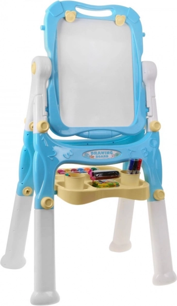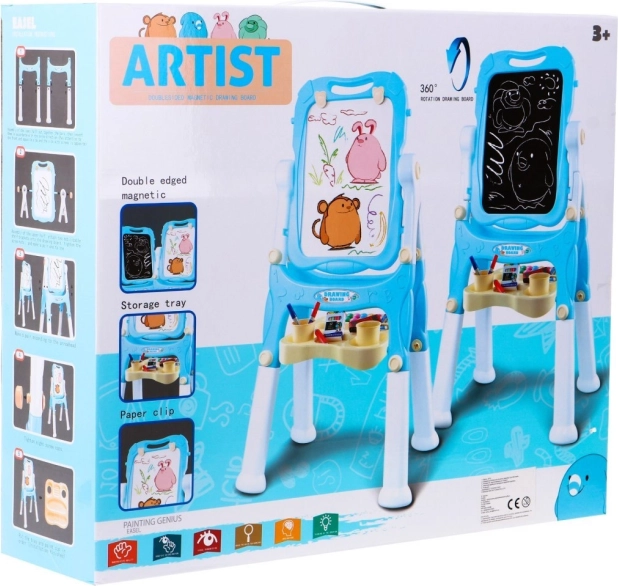 Двустранната дъска за рисуване е създадена да насърчава детство, изпълнено с креативност. На бялата страна децата могат да пишат с включените маркери и след употреба лесно да изтрият всичко с гъбичка. Магнитната функция позволява поставяне на цветни магнити, а щипките позволяват закрепване на хартия за допълнително рисуване.