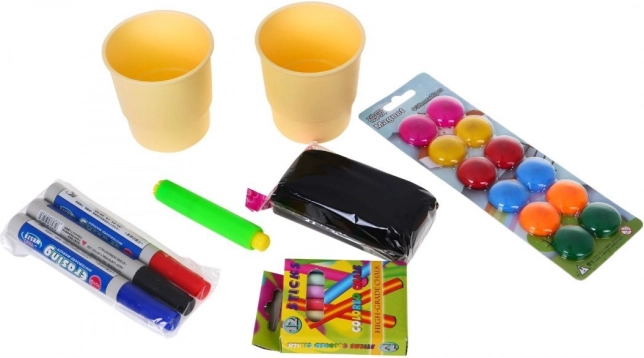 В комплекта са включени пластмасови чашки, комплект маркери, тебешири, магнити и държач за тебешири, които подпомагат всички видове художествени дейности.