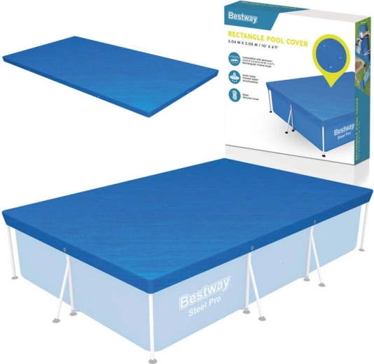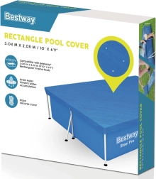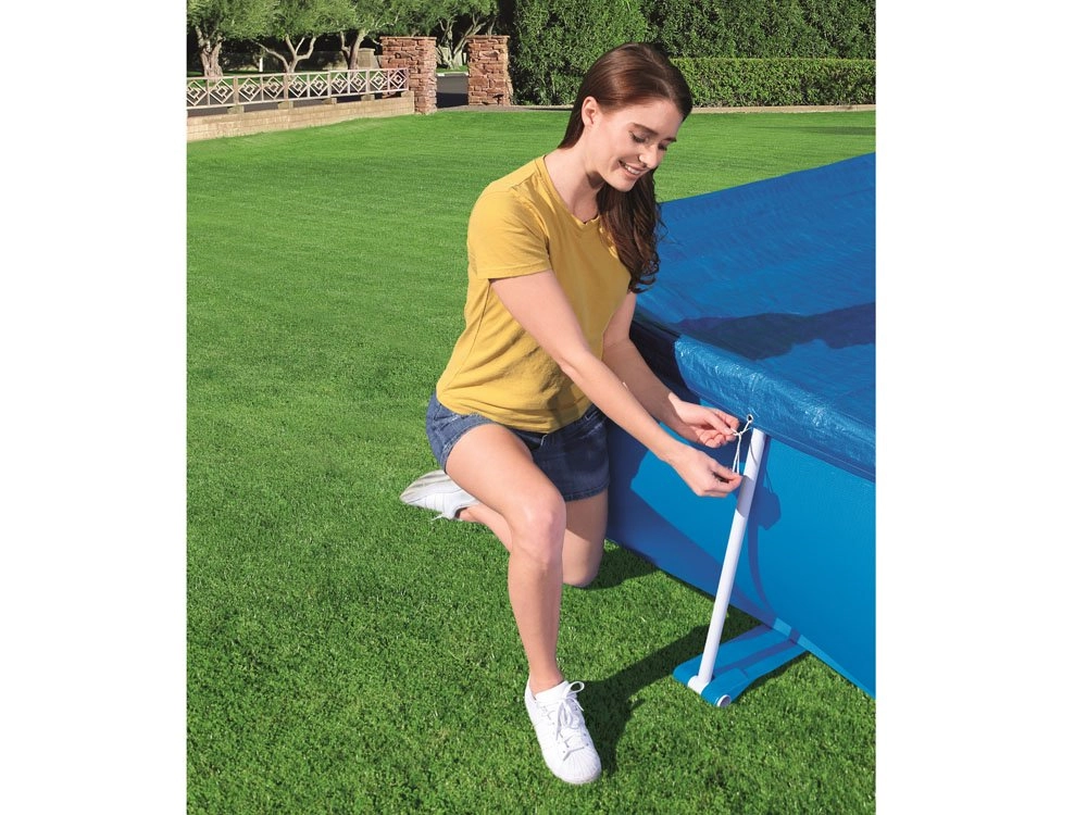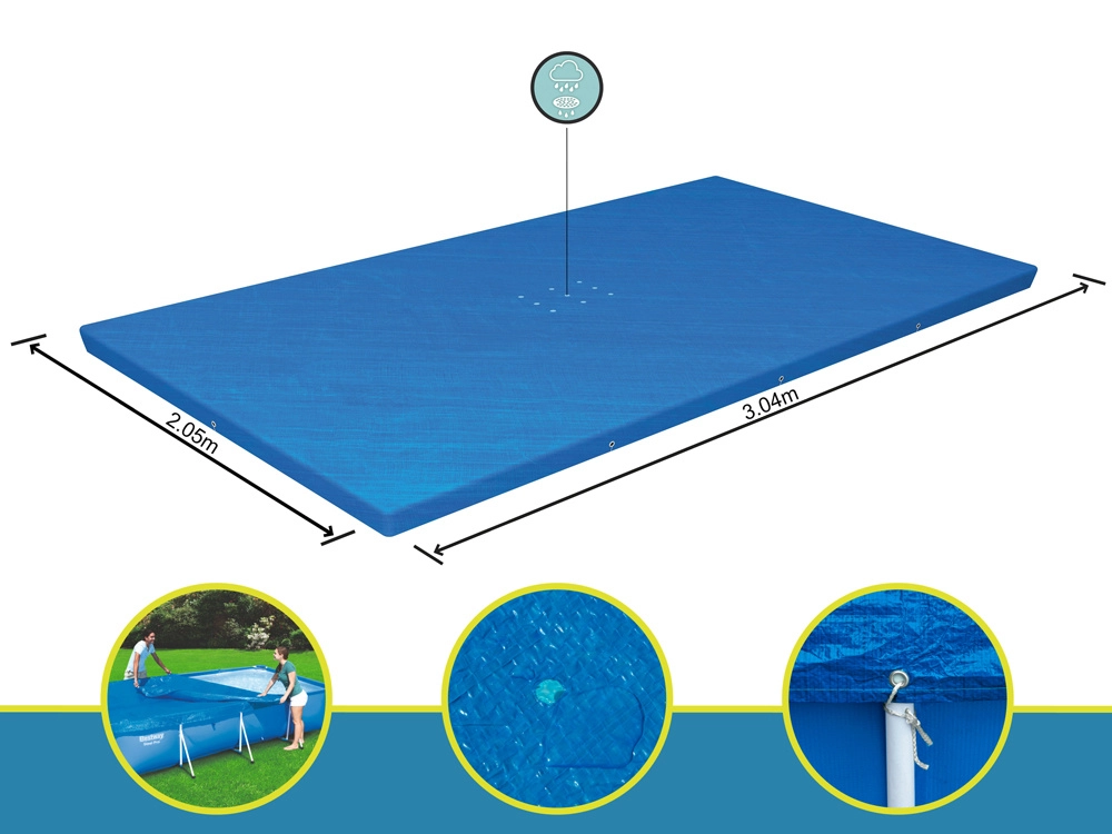Покривалото е проектирано да защитава вашия правоъгълен басейн с рамка с размери 300 x 201 см. Специалните отводнителни отвори на покривалото предотвратяват задържането на вода. Благодарение на интегрираните каишки лесно и сигурно закрепвате покривалото към конструкцията на басейна.