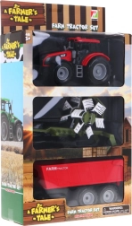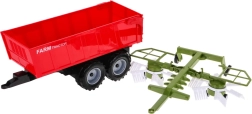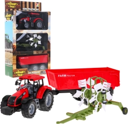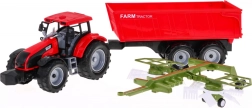 Реалистичен комплект за малки фермери от 3 години: червен трактор с фрикционно задвижване, накланящо се ремарке и функционален сеновършач. Здрава изработка, подвижни елементи и възможност за откачане и закачане на приставки подпомагат креативната игра и развитието на въображението.