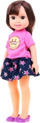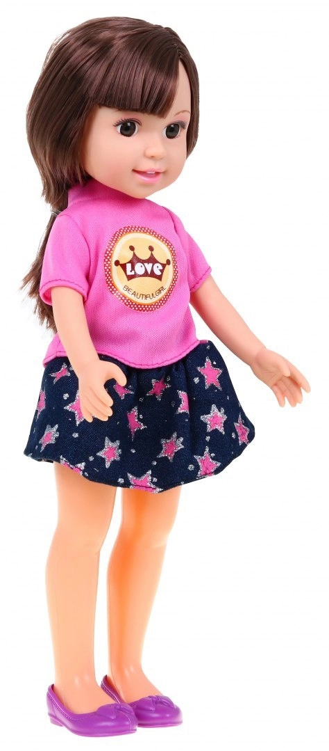 - Пълен комплект: кукла, рокля, тениска, пола, обувки, огледалце и гребен