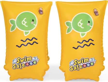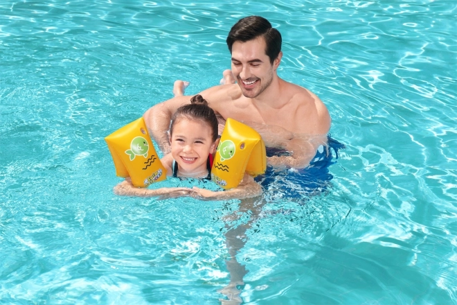 Ярко жълтите ръкавки със зелена рибка се виждат добре и мотивират децата да играят и да се учат във водата.