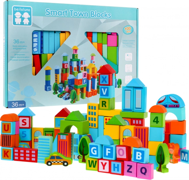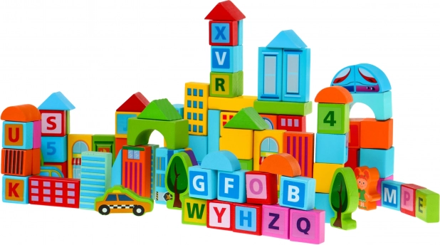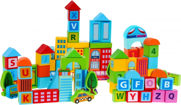 Дървените кубчета са сред най-обичаните играчки през поколенията. Този богат комплект съдържа 100 внимателно изработени елемента в различни цветове и форми, благодарение на които децата лесно ще построят град, мостове или кули. Повечето части са украсени с мотиви на животни, букви и форми, които естествено стимулират познанието и ученето чрез игра.