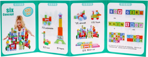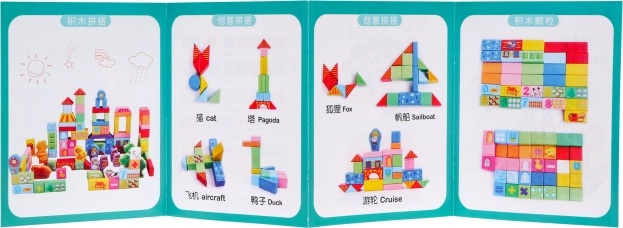 - 100 дървени кубчета с различни форми и цветове, илюстрирана вдъхновяваща брошура