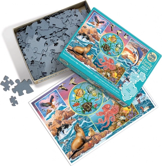 Насладете се на общото подреждане със семейния пъзел COBBLE HILL – Магията на океана от 350 части. Уникалната опаковка комбинира три размера части за деца, родители и баби и дядовци, така че всеки да намери своето темпо. Специалната неправилна щанца увеличава забавлението и предизвикателството, а щедрият формат 67,6 × 48,9 cm гарантира впечатляващ краен образ.