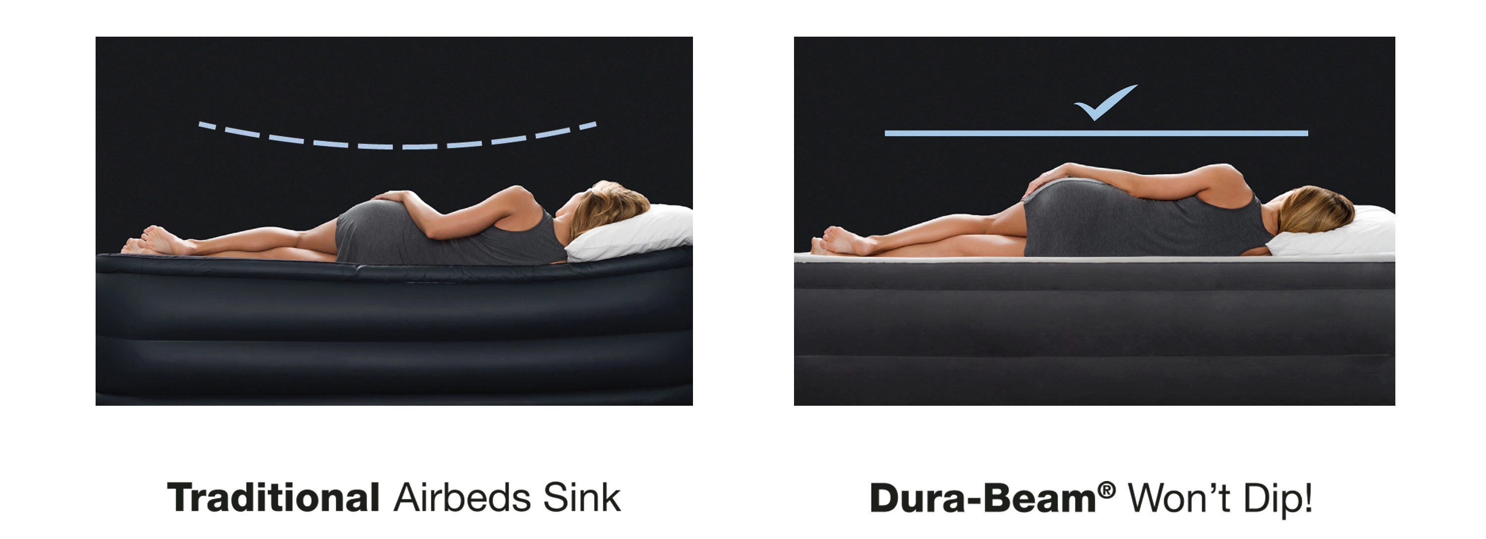 Вградената електрическа помпа позволява бързо и без усилие надуване и изпускане. Приятната велурена повърхност е щадяща към кожата и подобрява прилепването на чаршафа. Интегрираната надуваема табла осигурява опора при четене и почивка. Леглото се доставя с транспортна чанта и ремонтно кръпка.