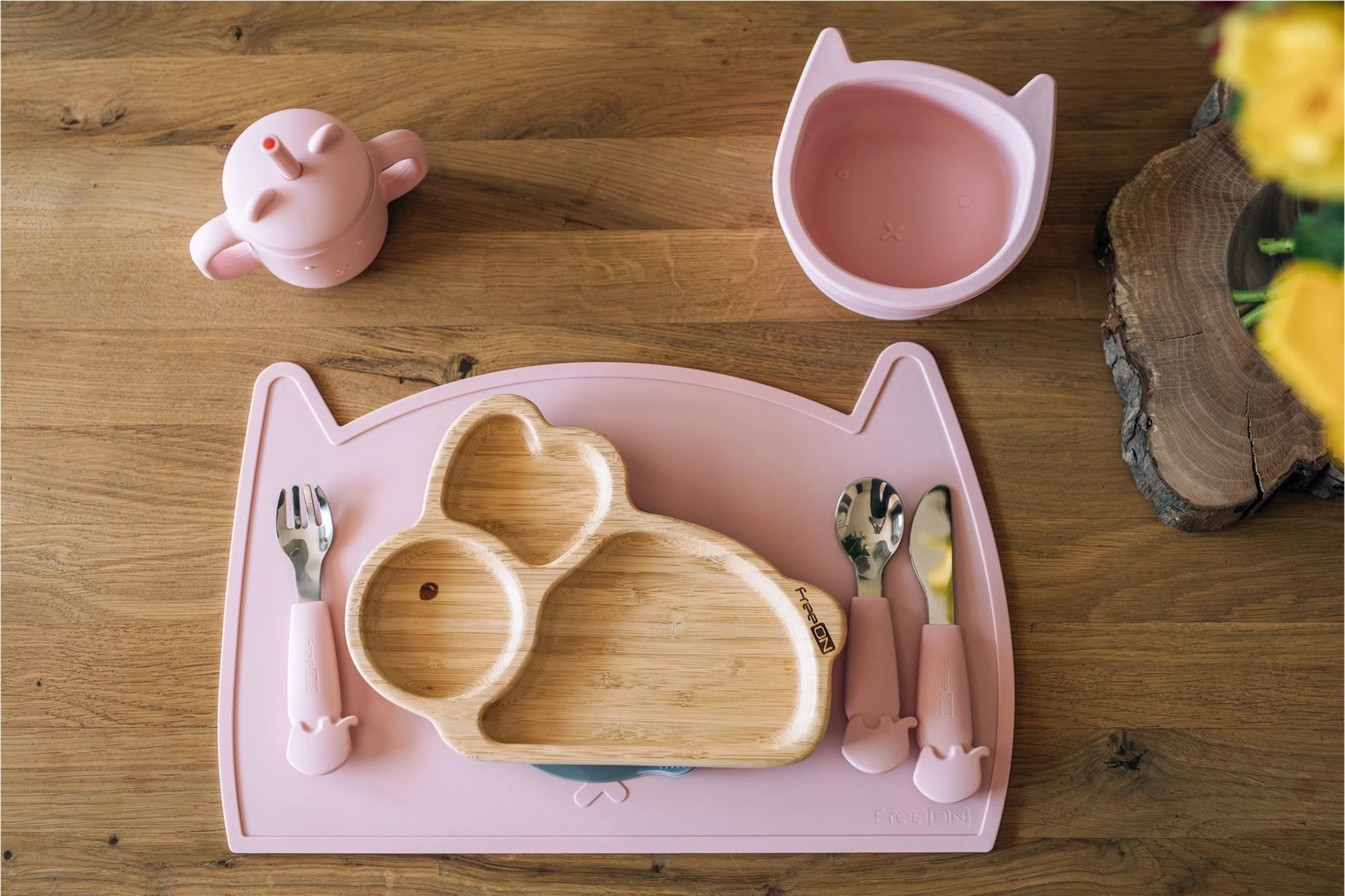 Очарователна детска чиния във формата на зайче от качествен бамбук с подвижна вендуза за стабилно закрепване към масата. Има 3 отделения за подредено сервиране, безопасни материали без BPA, PVC, фталати и меламин и лесна поддръжка.
