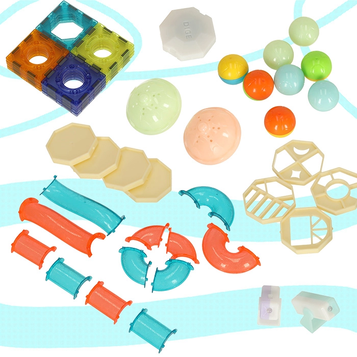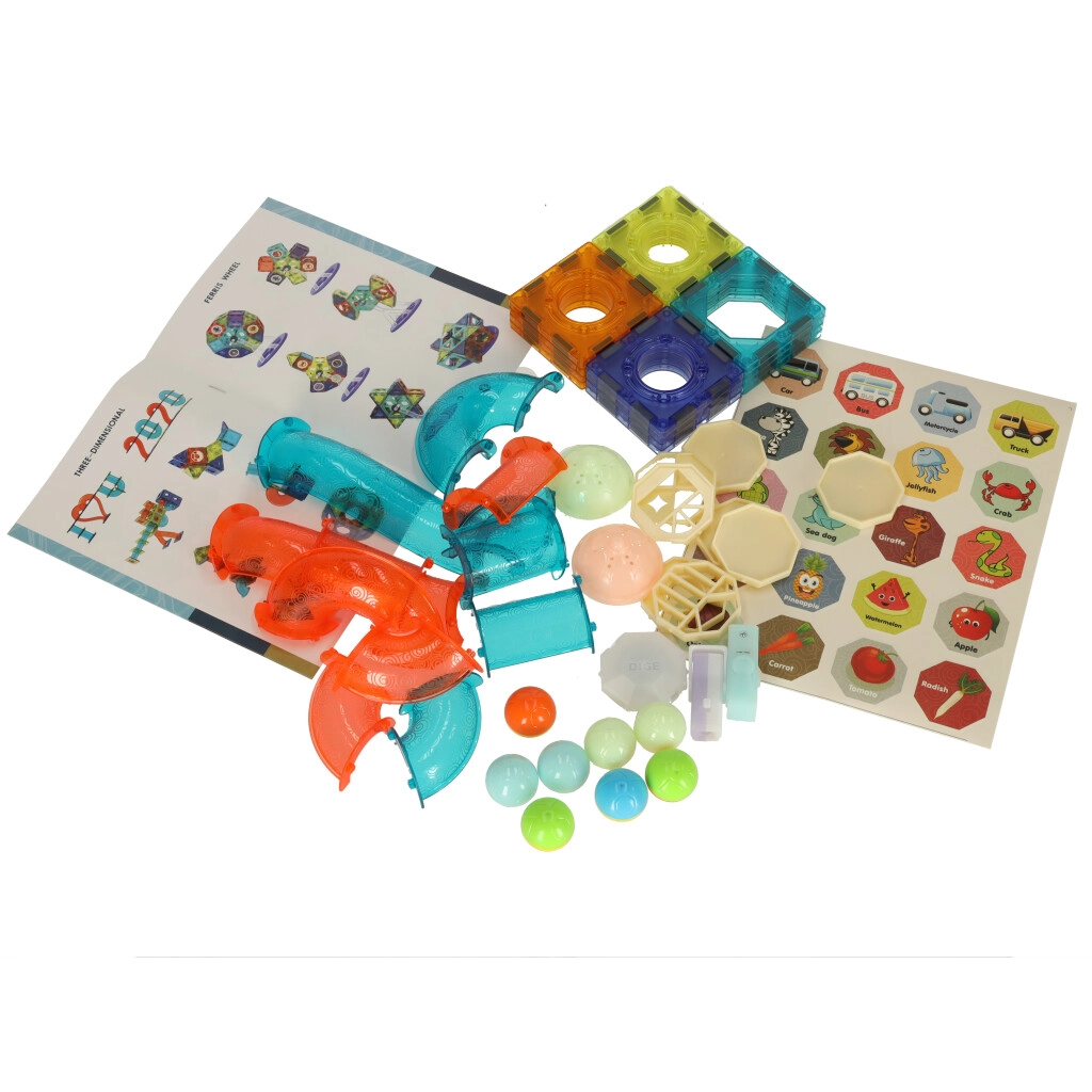 Комплектът предлага универсално строене в 2D и 3D: от прости форми до комплексни писти. Магнитните квадрати осигуряват стабилна конструкция, а тръбите и тунелите се поставят лесно „на щрак“. Благодарение на светещите елементи и топчета всяко спускане се превръща във забавно, визуално привлекателно представление.