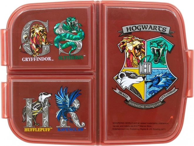 Практична детска кутия за закуска с три отделения с мотив HARRY POTTER поддържа храната разделена и свежа. Изработена е от устойчива пластмаса, побира се отлично в училищна раница и благодарение на сигурното закопчаване е идеална за път, за училище и за детската площадка.