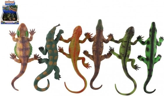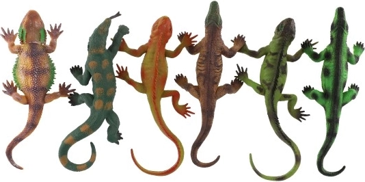 Този комплект съдържа 12 цветни гущера, оборудвани с вендуза отдолу, което позволява закрепване върху стъкло, плочки или други гладки повърхности. Всеки гущер е с дължина 22 cm, което осигурява лесна манипулация за децата. Играта с този комплект развива креативността, фината моторика и едновременно носи забавление и знания за природата.