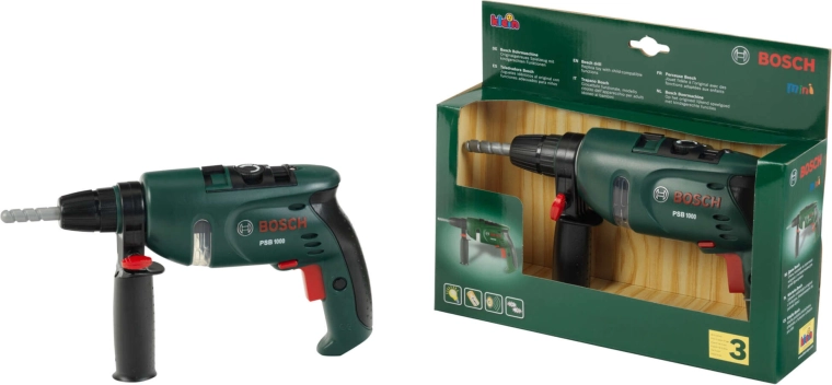 Тази детска бормашина в емблематичния зелен цвят на Bosch достоверно наподобява истински инструмент и предлага на децата забавна и безопасна игра на майстори. LED светлина и реалистичен звук при натискане на спусъка засилват изживяването и подпомагат фантазията и моториката.