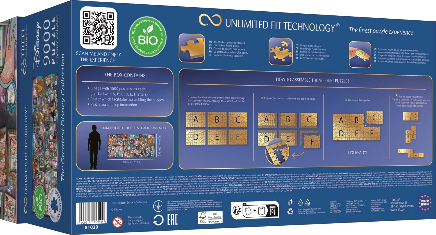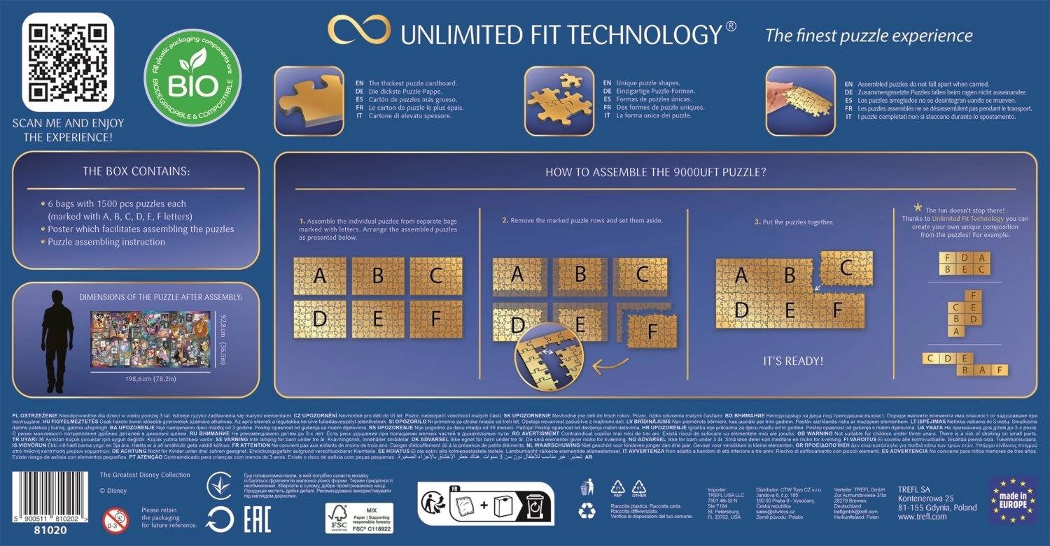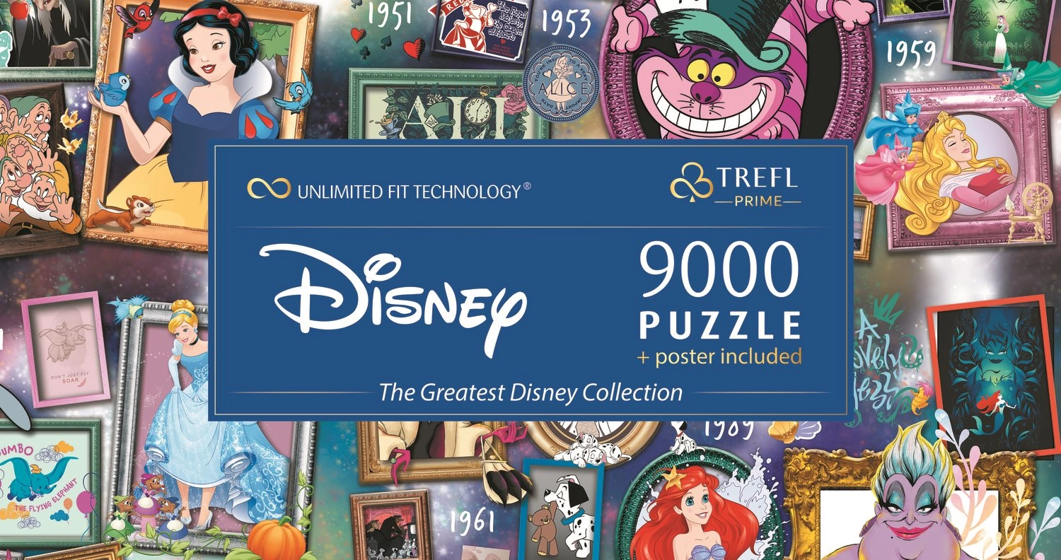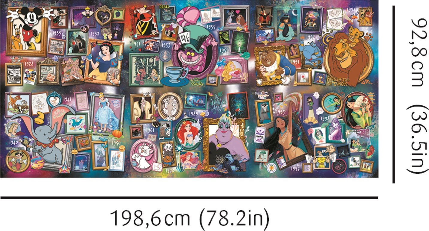 Тези големи пъзели ще ви отведат на вълшебно пътешествие в света на Disney. С общ размер на сглобената картина 1985,6 x 928 мм можете да изпитате търпението и уменията си, докато прекарвате време с семейство и приятели.