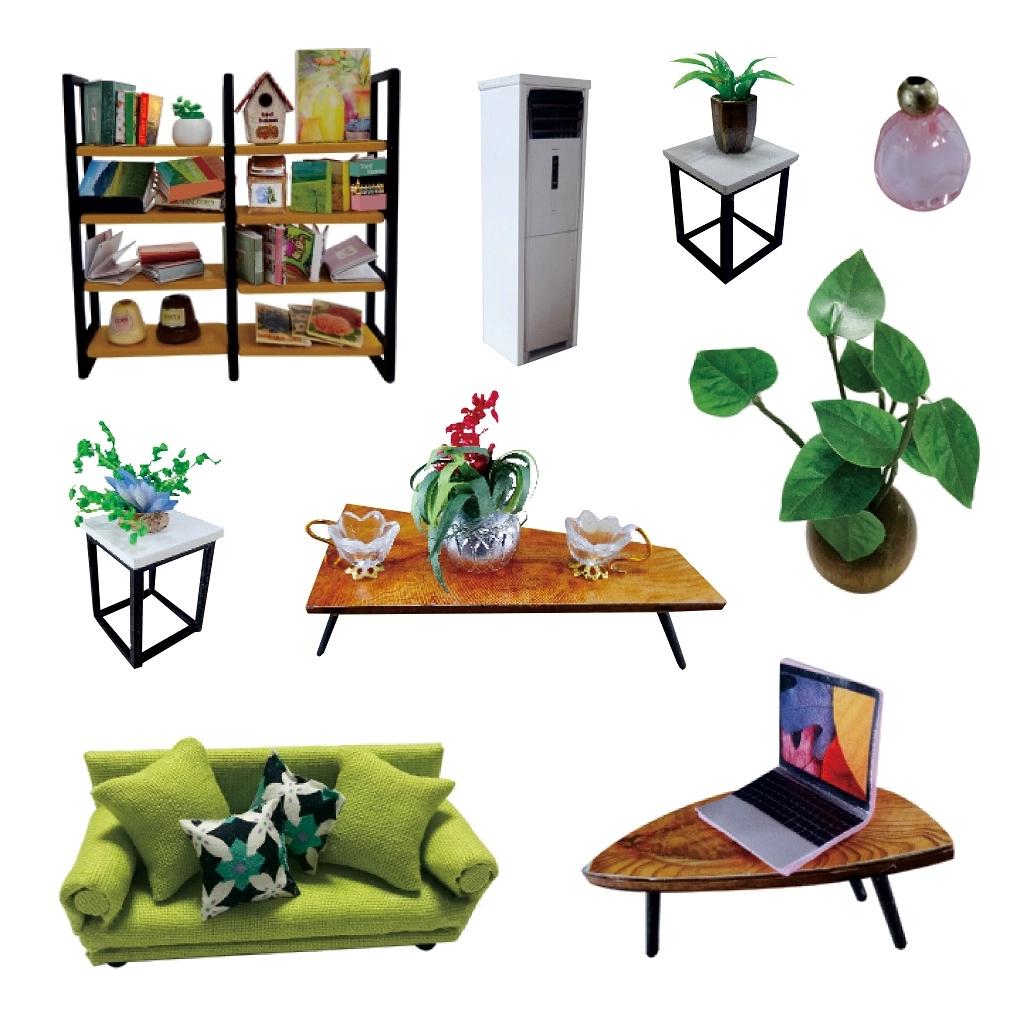 Сглобете мебели като в истински дом – от зеления диван до дървената холна маса.