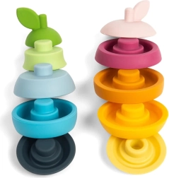 Пъстър комплект от две плодови пъзел-играчки, който съчетава подреждаща се играчка и гризалка в едно. Всеки плод има 5 части от 100% силикон без пластмаси, които децата подреждат в форма на ябълка и круша. Подпомага фината моторика, координацията око–ръка и възприятието за цветове, лесна за почистване и може да се мие в съдомиялна. Подходящо от 1 година.