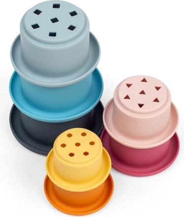 Силиконовите сгъваеми чашки BIGJIGS TOYS са универсална играчка за вода, плаж и детската стая. Седемте чашки с различен размер могат да се подреждат една върху друга или една в друга, а перфорираните дъна осигуряват забавно преливане и плискане с ефект на малък водопад.