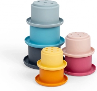 Безпластмасовият 100% силикон е мек за детските ръце и същевременно много устойчив на температури и петна. Поддръжката е лесна – достатъчни са топла вода и мек сапун или съдомиялна. Игрите с чашките подпомагат моторните умения, сензорното възприятие, баланса и ранното логическо мислене.