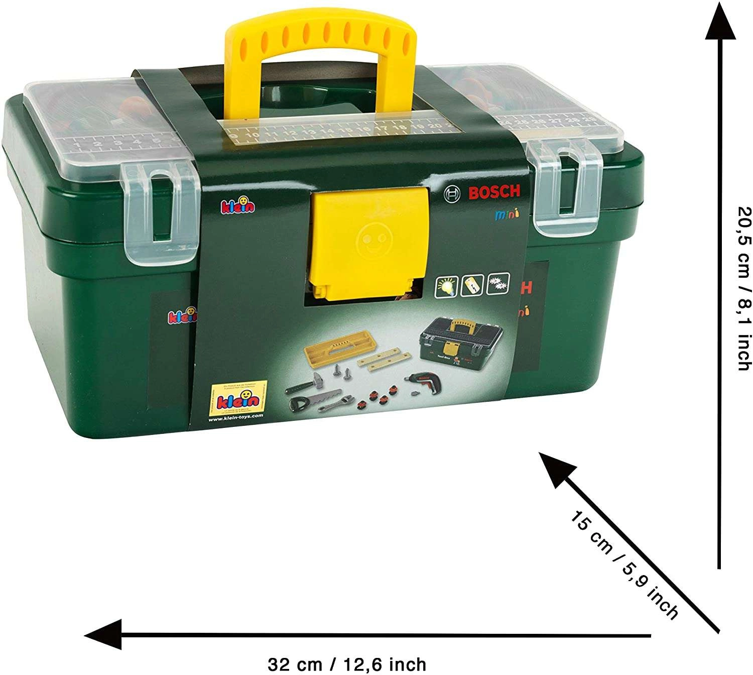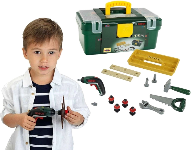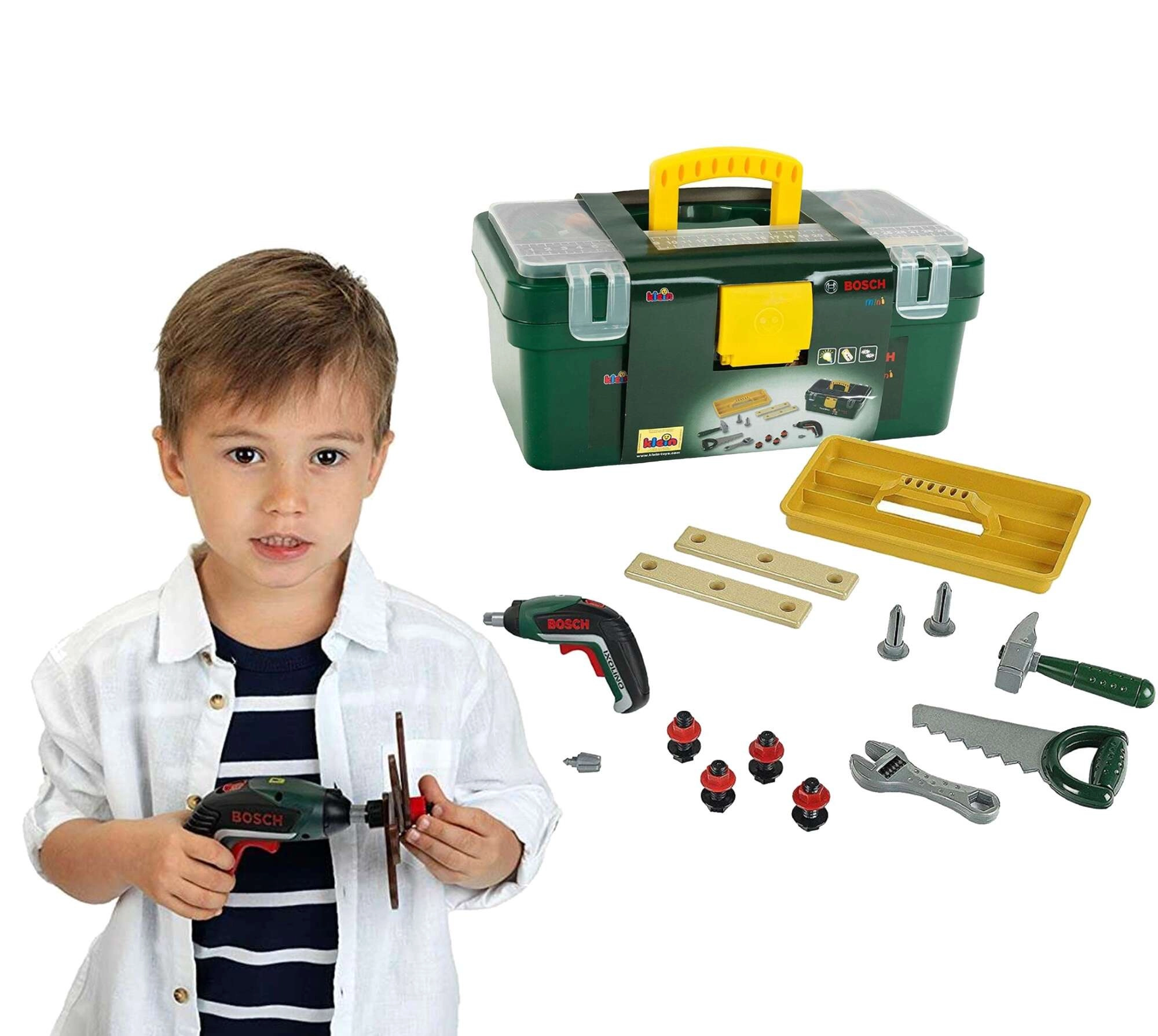 Детско куфарче с инструменти от марката KLEIN в лицензен дизайн BOSCH предлага безопасна и забавна игра „на ремонт“. Практично куфарче в тъмнозелено с жълта дръжка и прозрачен капак крие богата комплектация от инструменти, включително безжична бормашина IXOLINO II с въртене наляво/надясно, трион, чук, френски ключ, винтове и строителни пластини. Чудесен избор за развитие на фина моторика, креативност и ролева игра за деца от 3 години.