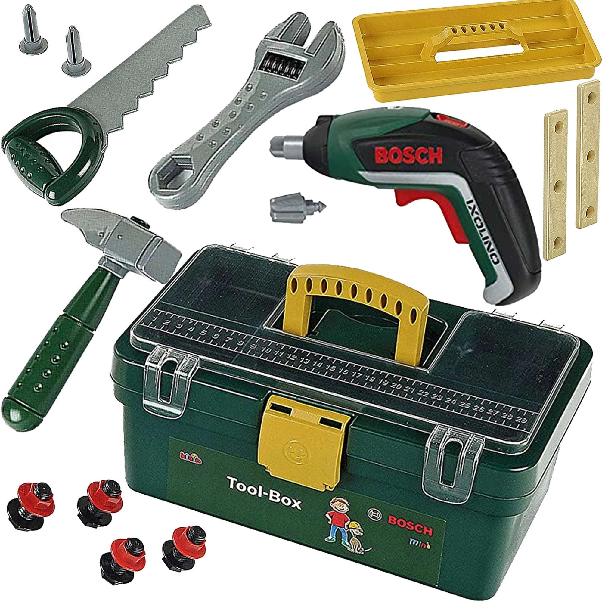 Главната звезда на комплекта е детската акумулаторна бормашина IXOLINO II с функция за въртене наляво/надясно и сменяеми битове. Допълнена е от класически инструменти – трион, чук и френски ключ – заедно с пластмасови пластини с отвори, винтове и гайки за реалистично завинтване. Всичко е изработено от качествена пластмаса с оглед на безопасността на децата.
