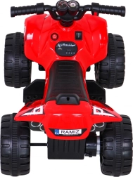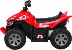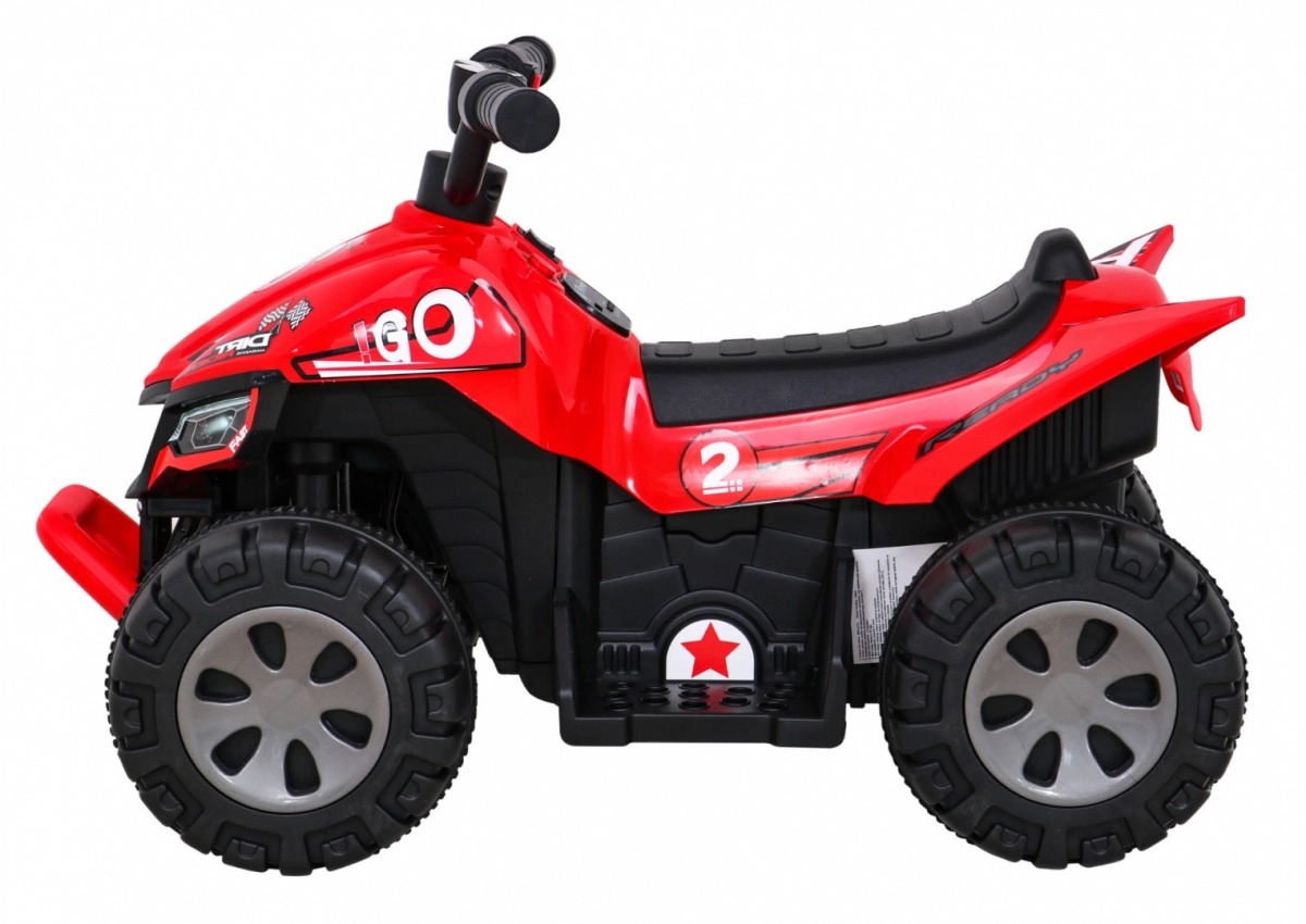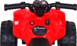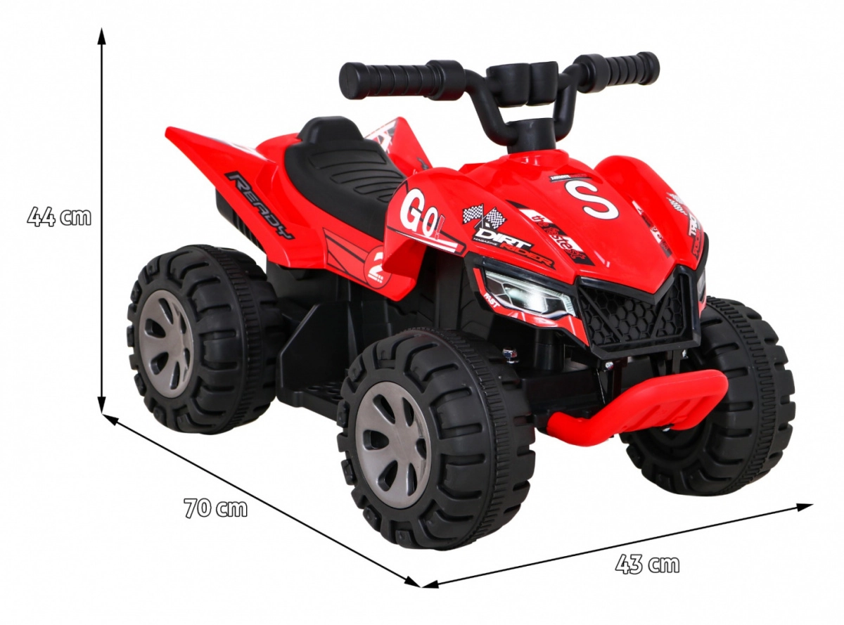 Тази червена детска четириколка THE FASTEST е отличен избор за малки водачи. Предлага лесно управление чрез бутон за газ в ръкохватката, движение напред и назад и удобно седло с размери 26 × 13 cm. Ниското тегло 5,5 kg и проходимостта благодарение на просвет 7 cm я правят идеална за равни повърхности у дома и в двора.