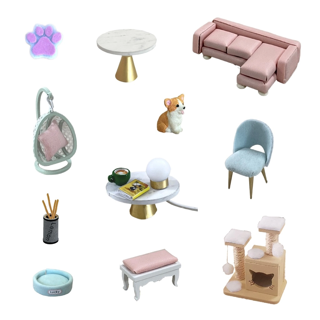 Удобен диван, висящ стол, елегантна маса и сладко котенце с драскалка – всеки елемент е прецизно проектиран за реалистична визия на интериора.