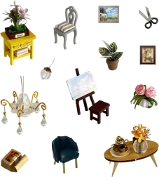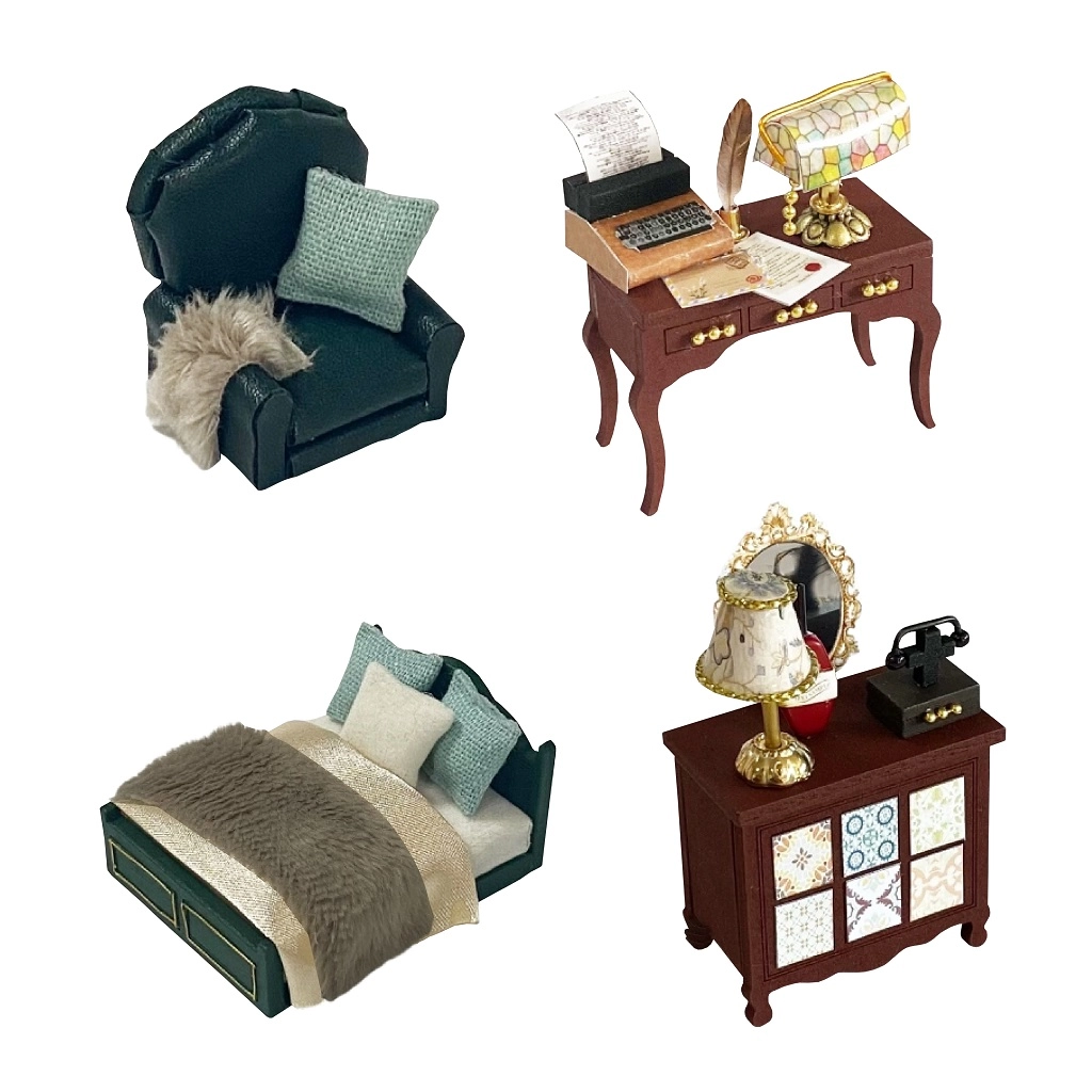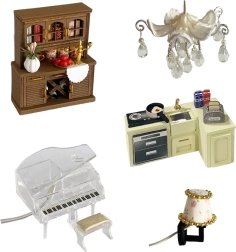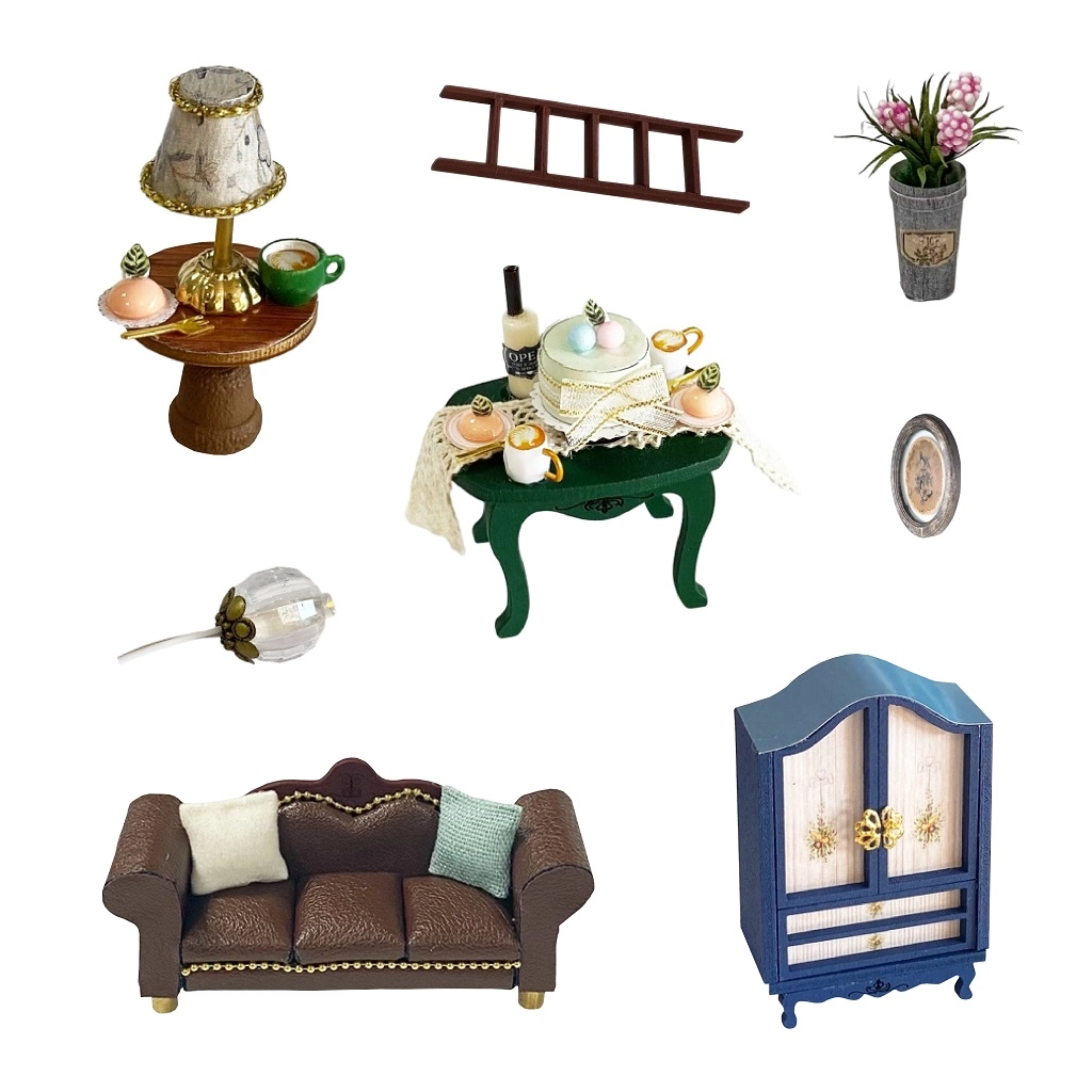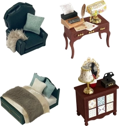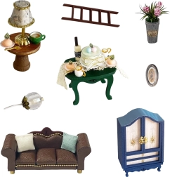 Включени са миниатюрни мебели и декорации, които лесно се сглобяват и подреждат. Всеки детайл подчертава реалистичния вид на готовия модел.
