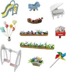 - Детайлни аксесоари – мебели, цветя, площадка за игра, декорации и други миниатюри.