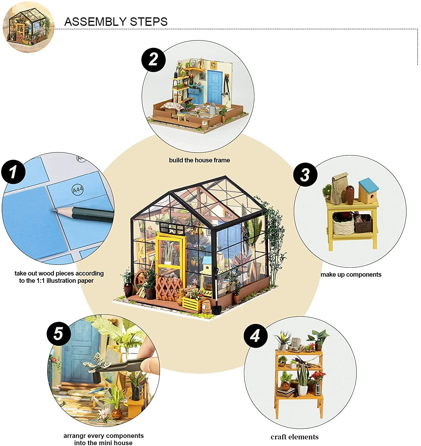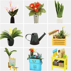 Открийте магията на миниатюрите с модела Robotime Mini Оранжерия. В кутията ще намерите предварително изрязани елементи от шперплат, хартиени принтове, текстилни и метални части, които след боядисване и сглобяване образуват впечатляваща оранжерия, пълна с растения и градински аксесоари. LED осветлението придава на завършения модел топла и уютна атмосфера.