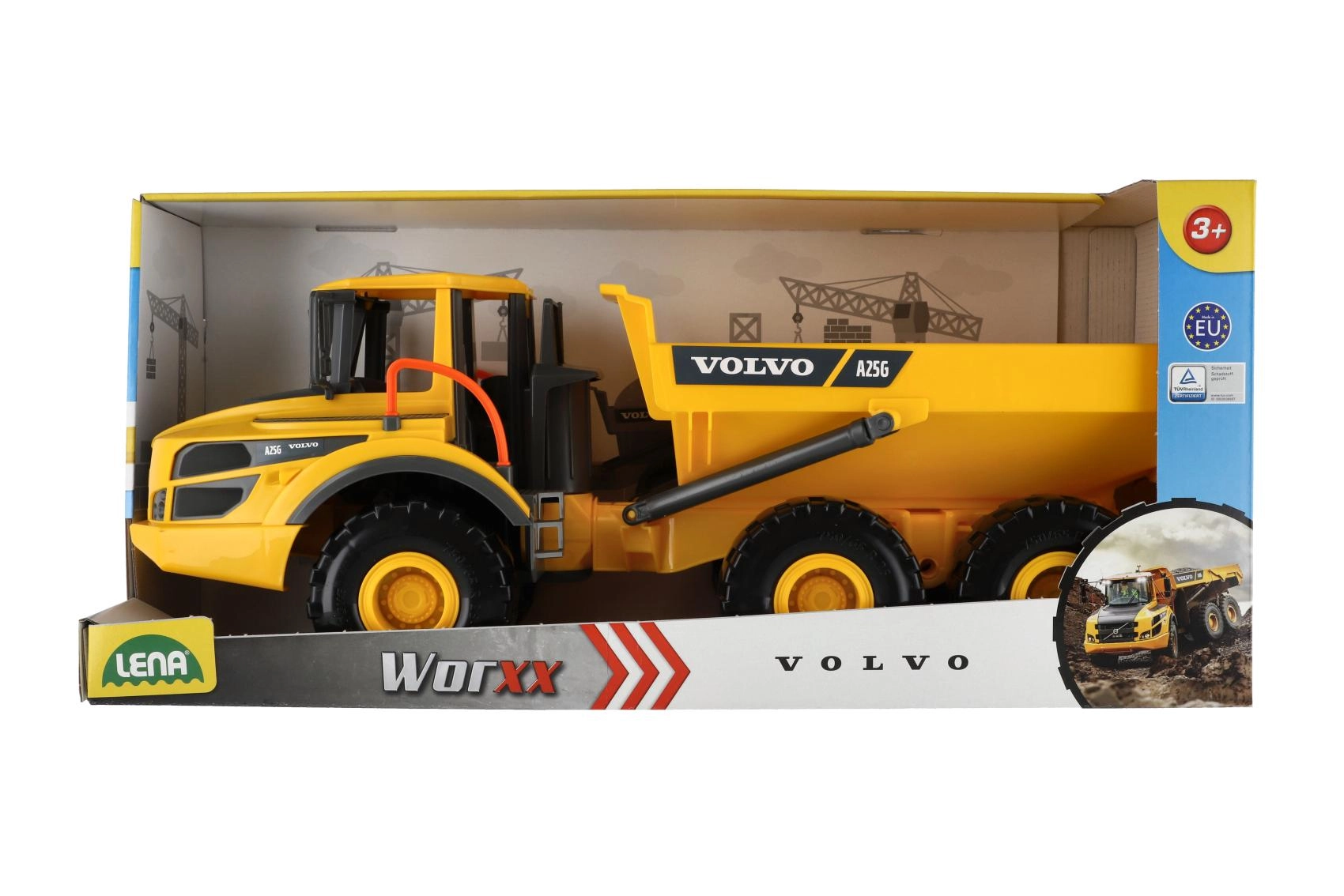 Здрав детски самосвал VOLVO A25G от серията Lena Worxx е изработен от висококачествена пластмаса и предлага изцяло механична функционалност, устойчива конструкция и съчленено управление за лесно маневриране. Благодарение на поцинкованите тройни оси с офроуд окачване се справя и с по-предизвикателен терен по време на игра.