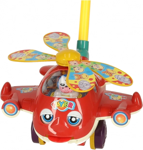 Дизайнът на играчката включва ярки цветове и весели мотиви, които привличат детското внимание. Червеният хеликоптер при движение върти перките и издава звук на звънче. Опорната дръжка е проектирана да отговаря на височината на детето и може лесно да се сгъне за удобно съхранение или транспортиране.